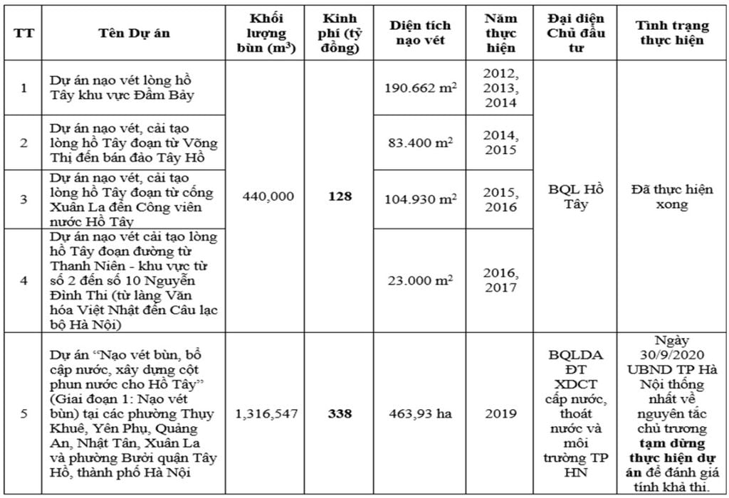 Bảng tổng hợp các Dự án nạo vét bùn Hồ Tây (Giai đoạn 2012~2019) Nguồn: Báo cáo nghiên cứu khả thi Dự án nạo vét bùn Hồ Tây